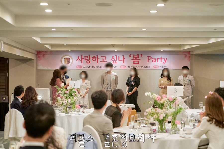 지난 4월 24일, 웨스틴 조선호텔 부산에서 다양한 직업군의 미혼남녀들이 참석한 퍼플스 부산 사교모임 파티 <사랑하고 싶나 봄:Private Party> 가 성황리에 개최되었습니다. 지난 1편에는 파티의 전체적인 분위기를 보여드렸다면 오늘 이 시간에는 부산 사교모임 파티를 즐기시는 회원님들의 모습을 생생하게 전해드리겠습니다.