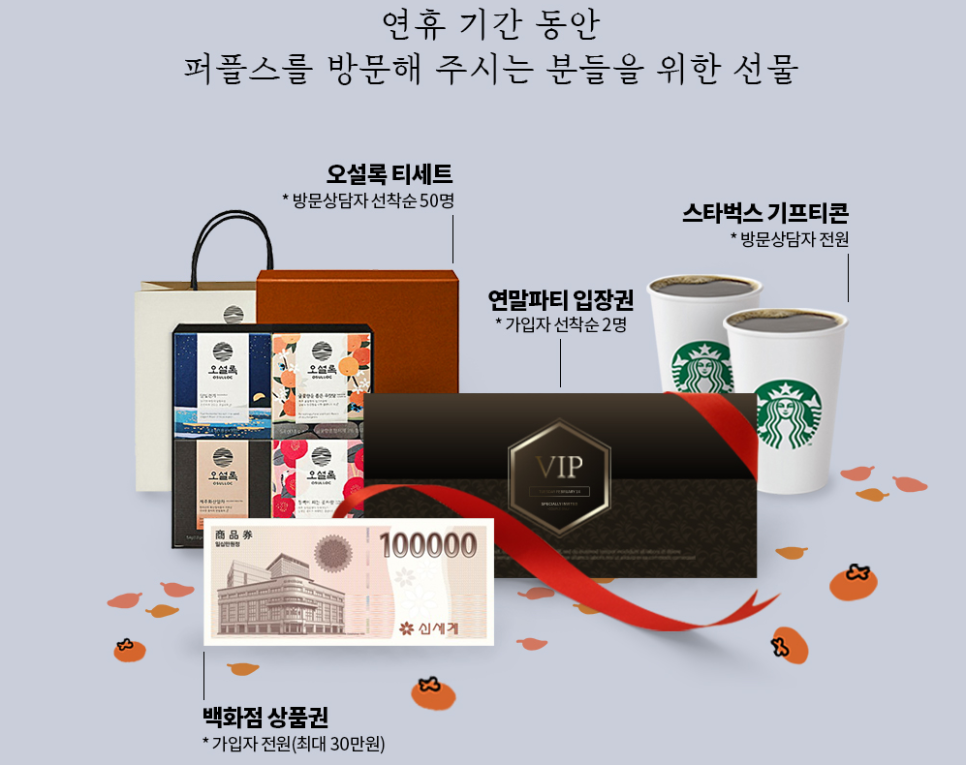 저희 강남결혼정보업체 퍼플스는 9월 30일~10월 4일 추석 연휴 기간 동안 방문 상담을 진행해 주시는 모든 회원분들을 위해 푸짐한 상품을 준비해보았습니다. 먼저, 방문상담자 전원에게 스타벅스 기프티콘을 제공할 예정이며 선착순 50명에게 프리미엄 티 브랜드 오설록 티 세트를 증정합니다. 또한, 가입자 전원에게 최대 30만 원 상당의 백화점 상품권을, 가입자 선착순 2명에게 최대 200명 규모의 강남결혼정보업체 퍼플스 연말 파티 입장권을 증정할 예정입니다.