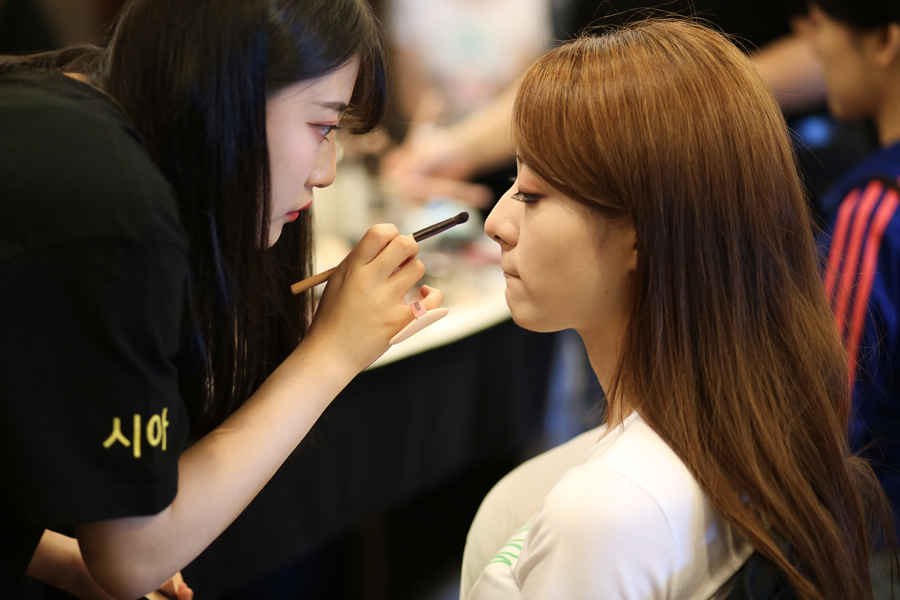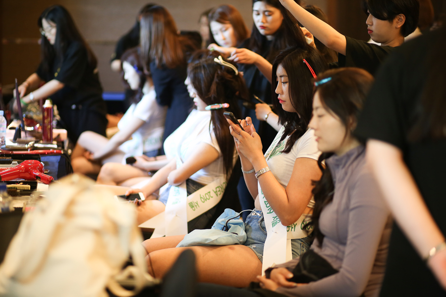 "본선 무대에 오르기 위해 메이크업과 헤어를 받고 있는 참가자들"