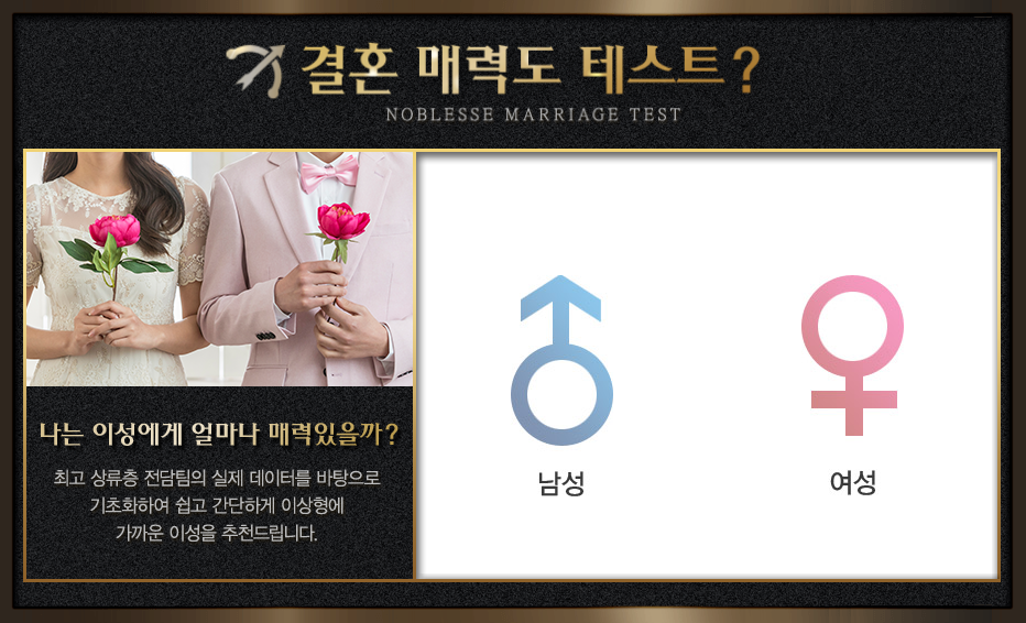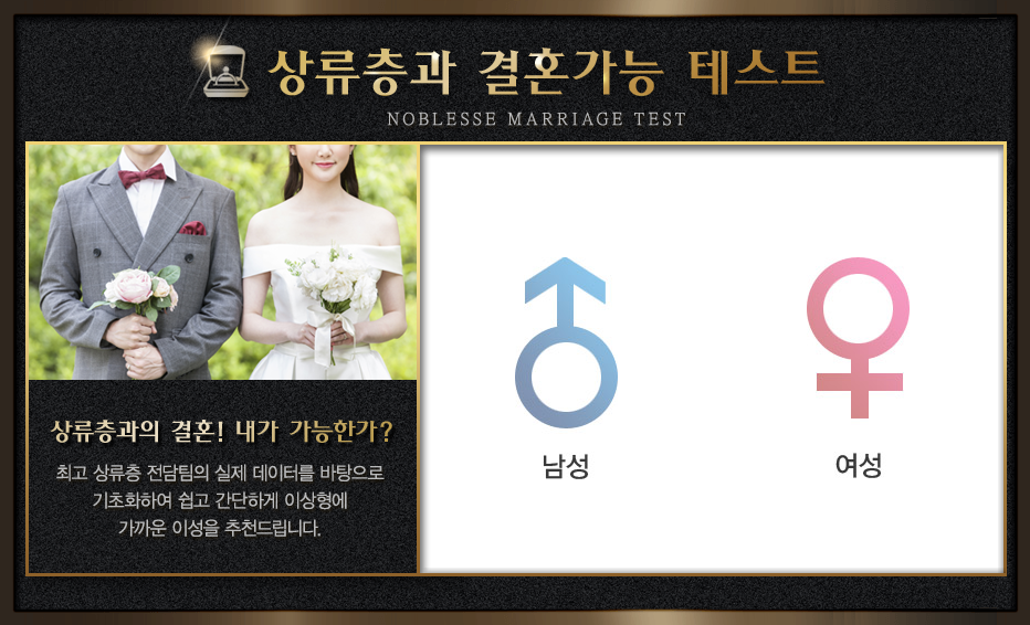 첫 번째 결혼테스트는 '상류층과 결혼 가능 테스트'입니다. 퍼플스 VIP 전담팀의 실제 데이터를 바탕으로 상류층과의 결혼 가능성을 알아보고 그에 맞는 맞춤 서비스를 제공받으실 수 있습니다.