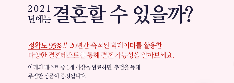 미혼남녀들을 위한 다양한 결혼테스트를 제공하고 있는 상류층 결혼정보업체 퍼플스가 푸짐한 상품과 함께 높은 정확도의 러브테스트를 준비해보았습니다. 그렇다면 결혼 가능성에 대해 알아보고 다양한 경품까지 가져가실 수 있는 3월 이벤트를 지금 바로 소개해드리도록 하겠습니다!