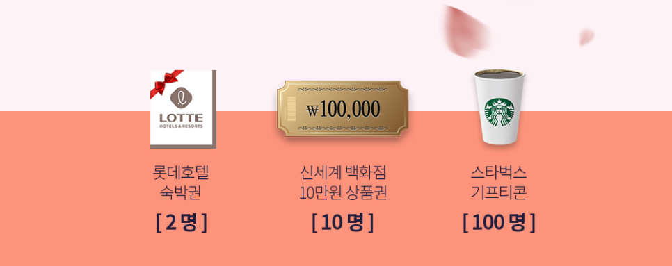 앞서 살펴본 테스트를 1개 이상 완료해 주신 분들 중 추첨을 통해 '2명에게 롯데호텔 숙박권', '10명에게 신세계 백화점 10만 원 상품권' 그리고 '100명에게는 스타벅스 기프티콘'을 증정할 예정입니다. 또한, 이벤트 기간은 '2021년 3월 1일부터 3월 31일'까지 한 달간 진행되며 참여 대상은 '만 24세 이상 미혼남녀' 분들이니 많은 관심 부탁드립니다.
