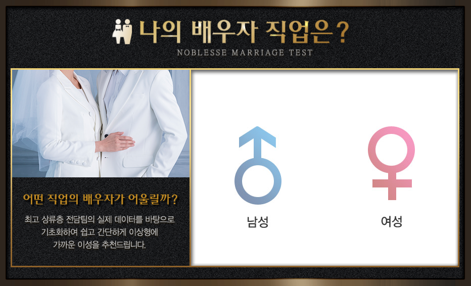 마지막 결혼테스트는 '미래 배우자 직업 테스트'입니다. 이 테스트는 상류층 결혼정보회사 퍼플스만의 노하우를 통해 본인과 잘 어울릴 수 있는 배우자를 추천받으실 수 있으며, 결과를 토대로 맞선 및 소개팅을 진행해보실 수 있습니다.