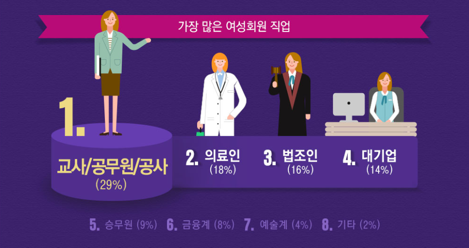 과거와 달리 여성의 사회 진출이 늘어나면서 남성뿐만 아니라 여성들의 '능력' 또한 중요시되고 있죠. 특히 결혼 상대를 결정할 때 다른 조건들보다도 여성의 직업적인 조건이 더욱 중요해졌으며, 남성들이 선호하는 여성의 직업 또한 존재한다고 합니다. 그렇다면 오늘 퍼플스 청담동 문화에서는 '공무원결혼정보회사가 말하는 남자에게 인기 많은 여자 직업'에 대해 함께 알아보도록 하겠습니다.