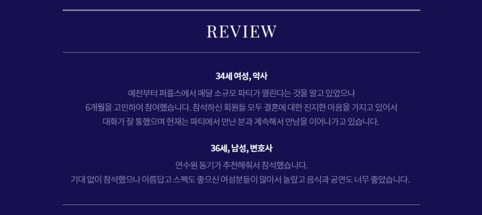 소규모 파티 참가가 고민이신 회원분들을 위해 지난 파티 후기를 전해드리려고 하는데요. 34세의 결혼 적령기 전문직 여성분께서는 많은 고민 끝에 퍼플스 파티에 참가하여 매우 만족스러운 만남을 이어나가고 있다고 하며, 36세 남성 회원분의 경우 기대 없이 참석한 퍼플스 파티였지만, 전반적으로 만족스러웠다는 후기를 남겨 주셨습니다. 이처럼 퍼플스 소규모 미팅파티는 회원분들에게 최고의 만족감을 선사하기 위해 최선의 노력을 다하고 있습니다.