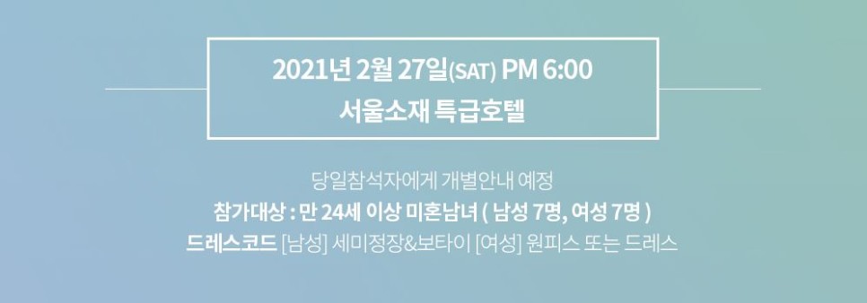 기독교결혼정보업체 퍼플스에서 준비한 미팅파티는 오는 2월 27일 토요일 저녁 6시, 서울소재 특급호텔에서 진행되며, 만 24세 이상 미혼 남녀 각각 7명씩, 총 14명이 참석 가능합니다. 소규모 파티인 만큼 의사, 회계사, 판사 등 전문직 회원분들과 대기업종사자, 가업승계자 등 개인 인맥으로 만나기 어려운 상위 0.1% 회원들을 만나보실 수 있는 좋은 만남이 되실 거라 생각합니다. 회원분들의 사생활 보호를 위해 정확한 장소는 당일참석자에게 개별 안내될 예정이오니 참고 바랍니다.