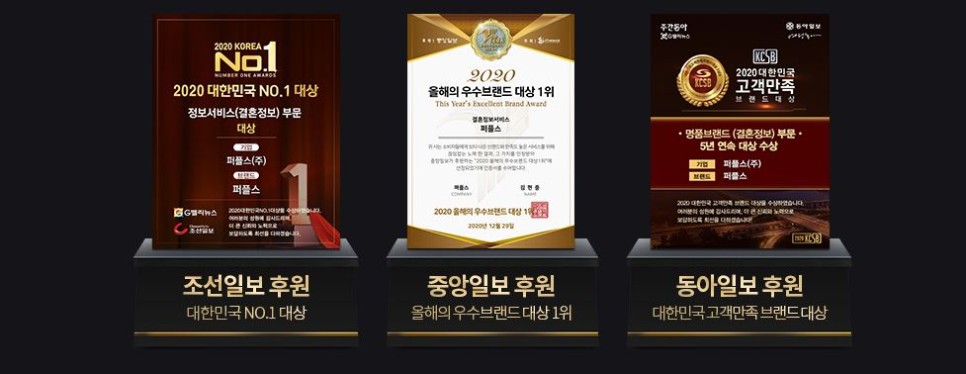 기독교결혼정보업체 퍼플스가 2017, 2018, 2019년도에 이어 2020년에도 대한민국 3대 언론사인 조선일보, 중앙일보, 동아일보가 함께한 각각의 브랜드 시상식에서 대상을 수상하는 영광을 누리게 되었습니다.