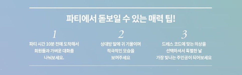 두 번째로 상대방의 말에 귀 기울이며 적극적인 모습을 보여주시길 바랍니다. 파티에 참석하시는 분들은 결혼을 목적으로 오시는 분들이 대부분이기 때문에 적극적인 분들에게 더욱 호감을 느낄 수 있습니다. 마지막으로 파티에 맞는 분위기의 의상을 선택해 주시길 바랍니다. 기독교결혼정보업체 퍼플스 미팅파티는 드레스코드가 주어지는데요. 남성의 경우 세미정장&보타이, 여성의 경우 드레스&원피스입니다. 드레스코드를 잘 숙지하셔서 자신의 매력을 더욱 어필해보시길 바랍니다.
