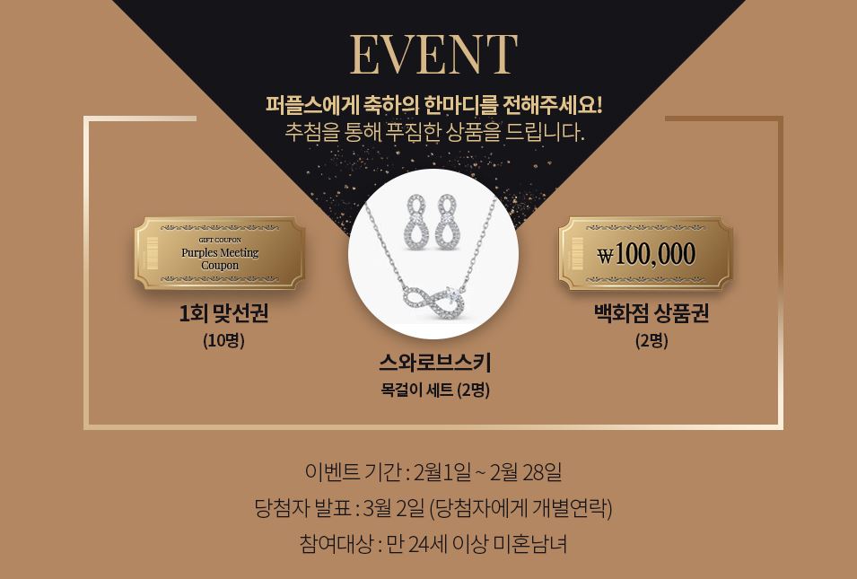 이를 기념하여 2월 한 달간 이벤트에 참여해 주신 만 24세 이상 미혼남녀 분들을 대상으로 푸짐한 상품을 증정합니다. 신청방법으로는 아래의 배너를 클릭하셔서, 퍼플스에게 축하의 한마디를 전하면 자동신청 완료됩니다. 추첨을 통해 스와로브스키 목걸이 세트(2명). 백화점 상품권(2명). 1회 맞선권(10명)이 증정되며 당첨자에게는 3월 2일, 개별연락 갈 예정입니다. 많은 참여바랍니다.