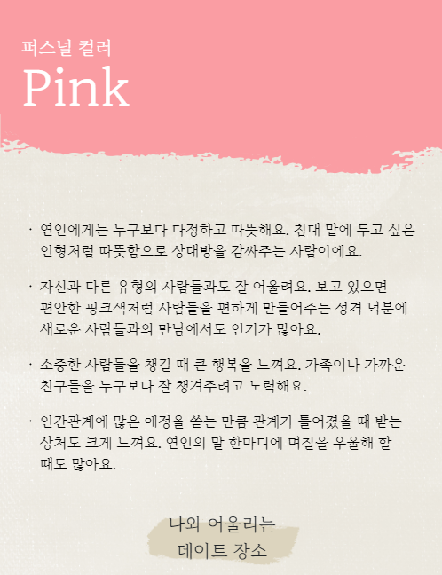 <내 연애 퍼스널컬러 찾기> 테스트 결과는 '핑크'가 나왔습니다.연인에게 누구보다 다정하고 따뜻하며 보고 있으면 편안한 핑크처럼 다른 사람들을 편하게 만들어준다고 해요. 소중한 사람들을 챙길 때 큰 행복을 느끼고 인간관계에 많은 애정을 쏟는다고 하네요! 과연 여러분들의 <내 연애 퍼스널컬러 찾기> 테스트 결과는 무엇이 나왔나요? 아래 사이트에서 직접 <내 연애 퍼스널컬러 찾기>를 진행해 보시기 바랍니다!