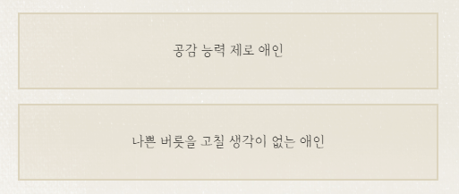 공감 능력이 없는 것과 나쁜 버릇을 고칠 생각이 없는 것 중 어떤 게 더 별로인가요? 개인적인 의견으로 많이 갈릴 것 같은 질문이네요!