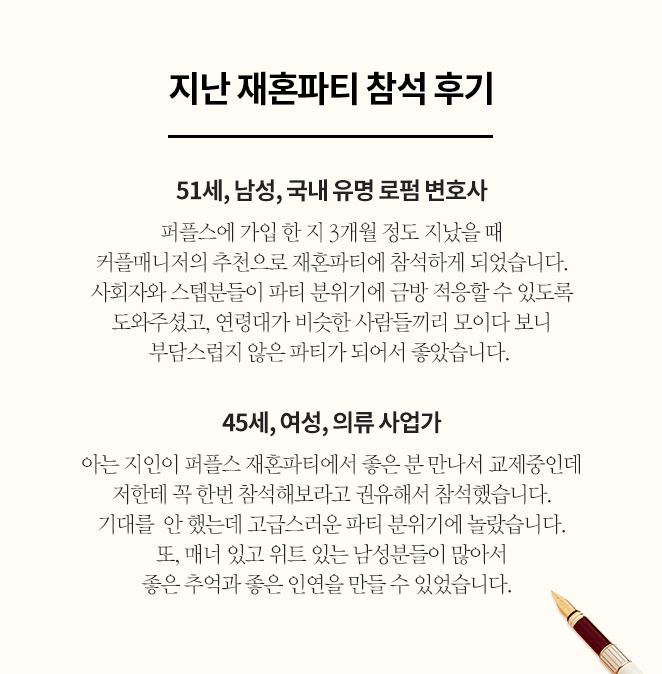 지난해에 진행된 노블레스결혼정보회사 퍼플스 재혼파티에는 총 여섯 커플이 탄생하면서 회원들의 만족도가 정말 높았는데요. 51세 국내 유명 로펌 변호사인 남성 회원은 "연령대가 비슷한 사람들끼리 모이다 보니 부담스럽지 않은 파티가 되어서 좋았습니다"라며 후기를 남겨주셨으며 34세의 여성의류 사업가 여성 회원은 "매너 있고 위트 있는 남성분들이 많아서 좋은 추억과 좋은 인연을 만들 수 있었습니다"라고 전해주셨습니다.