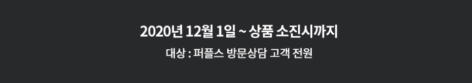 본 이벤트는 노블레스 결혼정보회사 퍼플스 방문상담 고객 전원을 대상으로 하며, 이벤트 기간은 2020년 12월 1일부터 상품 소진 시까지 진행될 예정입니다. 또한, 연말은 방문상담이 급증하는 시기이기 때문에 빠른 상품 소진이 예상됨으로 결혼 상담을 희망하시는 분들은 미리 예약하시는 것을 추천드리며, 12월 신규 가입 이벤트는 퍼플스 전국 지사(서울, 대구, 대전, 부산, 광주)에서 진행됩니다.
