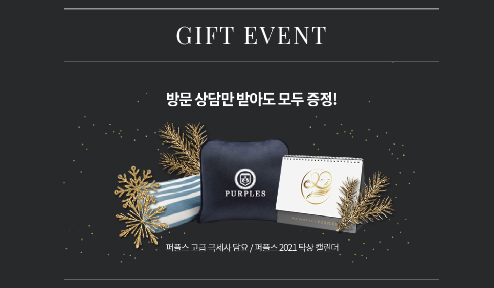 코로나 바이러스로 모두 힘든 시기임에도 불구하고 노블레스 결혼정보회사 퍼플스를 찾아주신 수많은 고객 여러분께 다시 한번 감사드리며 퍼플스에서는 그 성원에 보답하기 위해 12월 신규 가입 상품 증정 이벤트를 준비하였습니다.