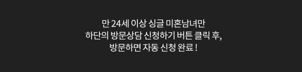 본 이벤트는 만 24세 이상 싱글 미혼남녀에 한해 참여가 가능하며 아래 <무료 방문 상담 신청하기> 배너를 클릭하여 방문 상담을 진행해 주시면 4월 이벤트에 자동적으로 신청이 완료됩니다. 상담과 함께 준비된 푸짐한 상품과 혜택! 놓치지 마시기 바라며, 많은 관심 부탁드립니다.