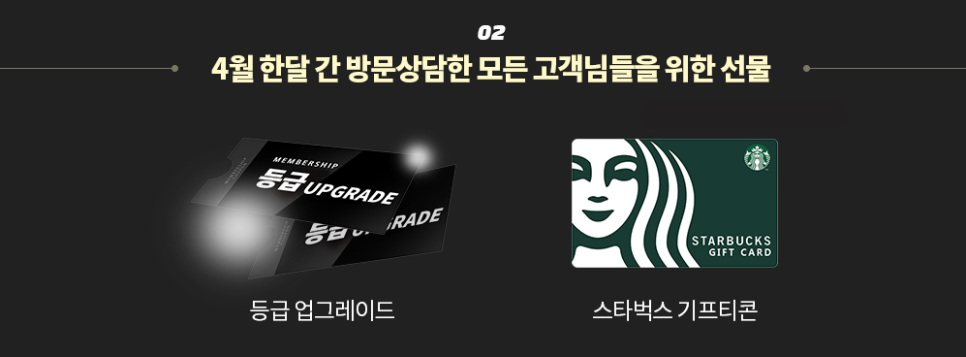 4월 이벤트인 만큼 한 달간 방문 상담을 해주신 모든 고객님들을 위한 선물도 준비되어 있는데요. 첫 번째로는 방문 상담 고객 전원에게 '스타벅스 기프티콘'을 증정할 예정이며 두 번째로 '등급 업그레이드'를 통해 만족스러운 성혼 서비스를 제공받으실 수 있도록 준비해 보았습니다.
