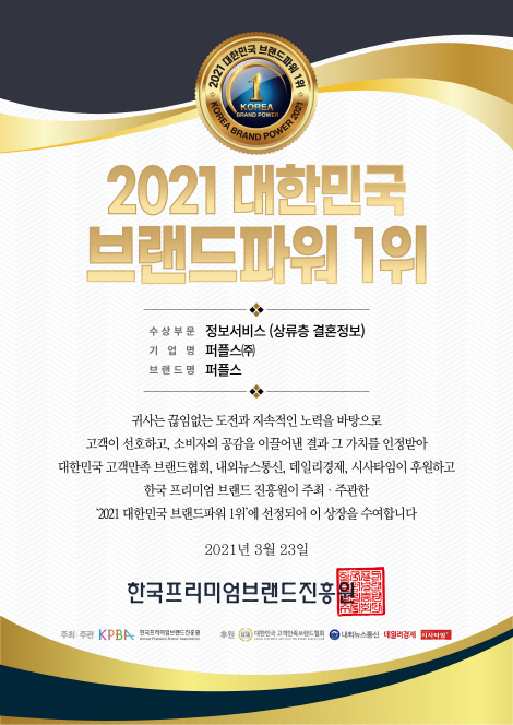수많은 대구 미혼남녀들의 성혼을 이뤄드리고 있는 대구결혼정보회사 퍼플스가 서울에서 열린 '2021 대한민국 브랜드파워 1위'에서 2년 연속, 당당히 수상을 거머쥐게 되었습니다. 모든 영광을 대구결혼정보회사 퍼플스를 이용해 주시고 믿어주시는 회원님들에게 돌리도록 하며 오늘 이 시간에는 생생한 수상의 현장을 전해드리겠습니다.