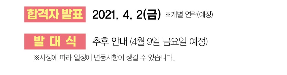 합격자 발표는 '2021년 4월 2일 금요일' 개별 연락 예정이며 4월 9일 금요일 예정되어 있는 발대식은 추후 안내드리도록 하겠습니다. 퍼플스 대학생 서포터즈 2기 일정은 사정에 따라 변동 사항이 생길 수 있는 점 참고 부탁드립니다.