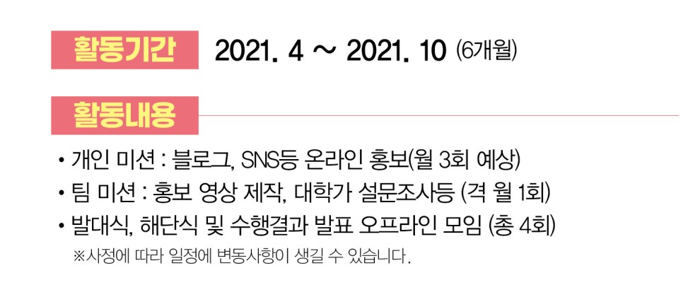 대학생 대외활동 추천! 퍼플스 대학생 서포터즈 2기 활동은 '2021년 4월부터 2021년 10월'까지 약 6개월간 진행되며 월 3회의 블로그, SNS 온라인 홍보와 격 월 1회의 팀 미션 그리고 총 4회의 발대식, 해단식 및 수행 결과 발표 오프라인 모임이 예정되어 있습니다.