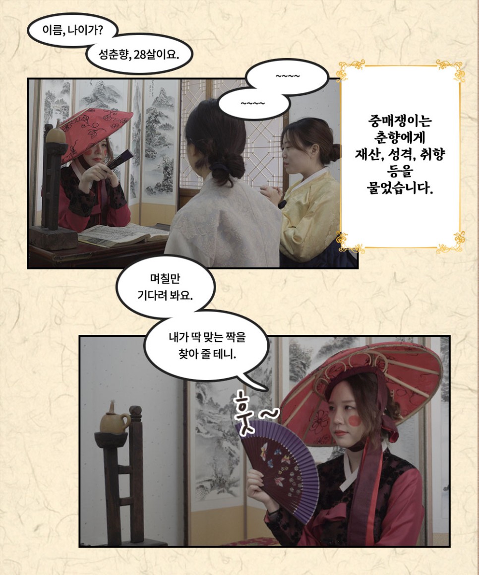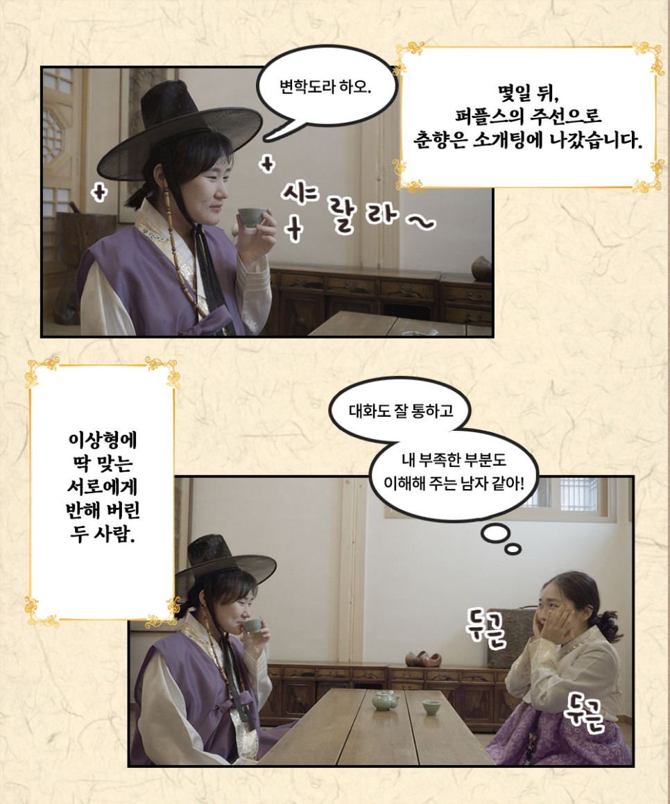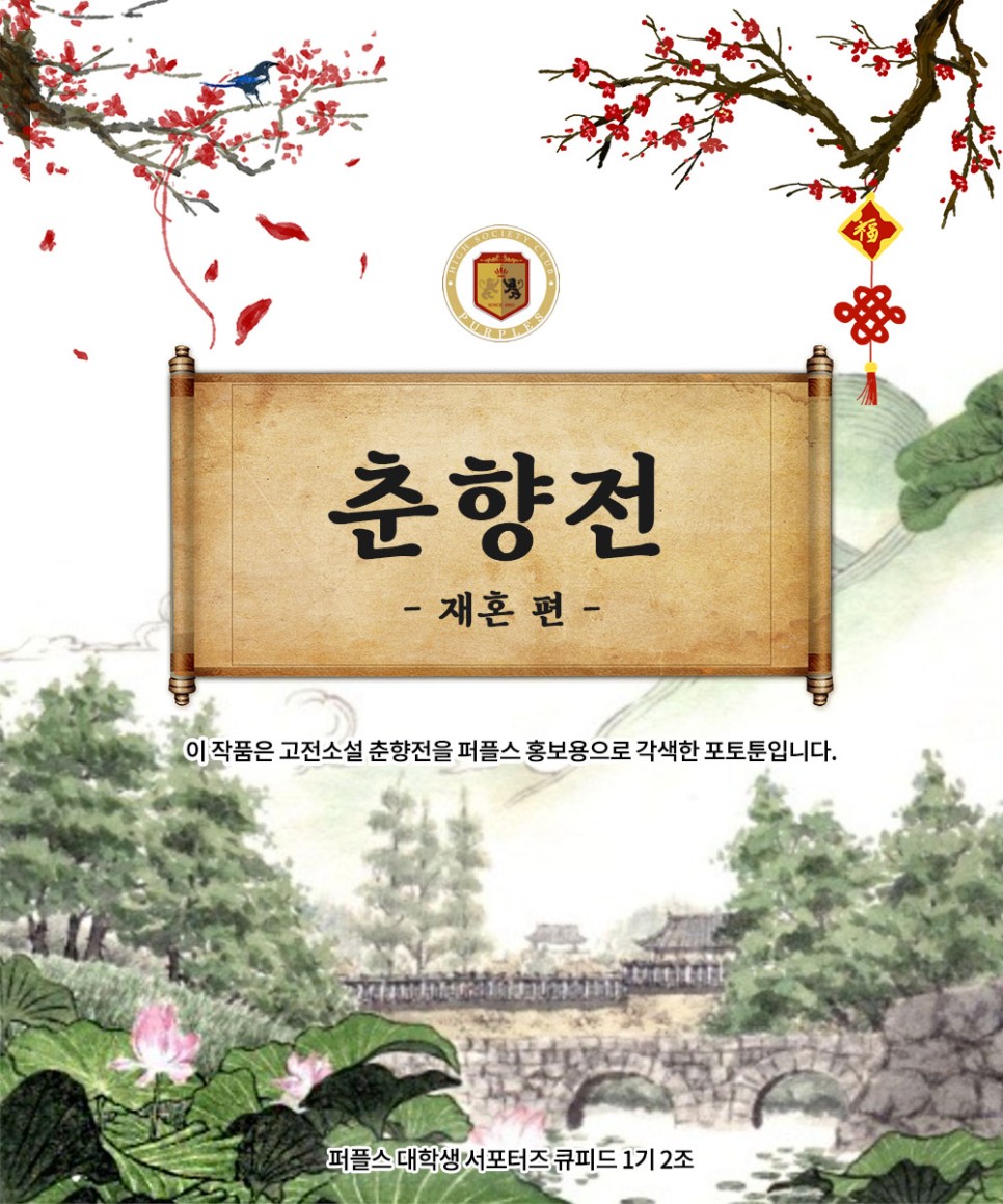 대학생 대외활동 퍼플스 서포터즈 1기 최우수팀인 '2조'는 춘향전을 각색하여 멋진 포토튠을 제작해 주었습니다. 마찬가지로 2조의 포토튠 내용을 간단히 설명해드리면, 이몽룡과의 불안한 신혼생활을 지속하던 춘향이 퍼플스를 통해 변학도와 재혼하게 되는 이야기입니다. 익히 알고 있는 고전 소설인 <춘향전>을 각색하여 재미있게 퍼플스를 홍보할 수 있었던 포토튠이었습니다.