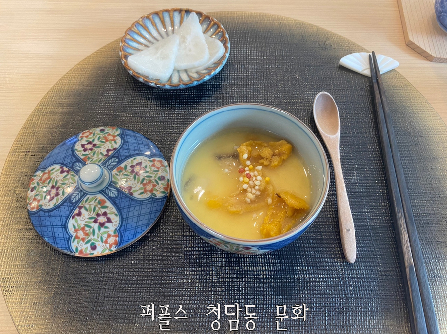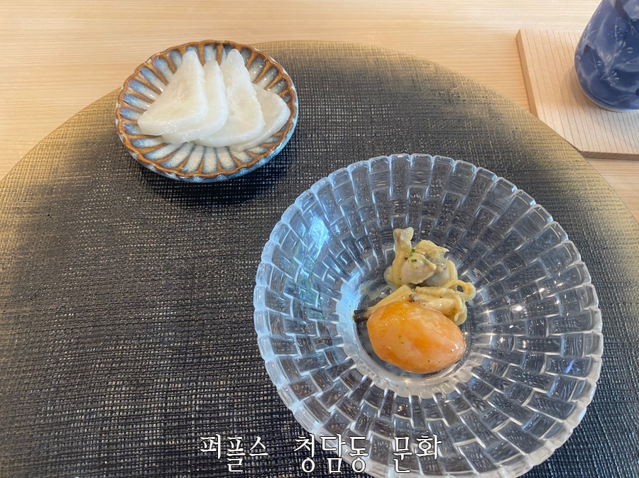 본격적인 스시가 시작되기 전에 전채요리로 바질소스에 버무린 바지락 & 토마토와 차완무시가 나왔습니다. 또한, 음식의 입맛을 돋우어줄 유자에 절인 무도 함께 제공되었습니다.