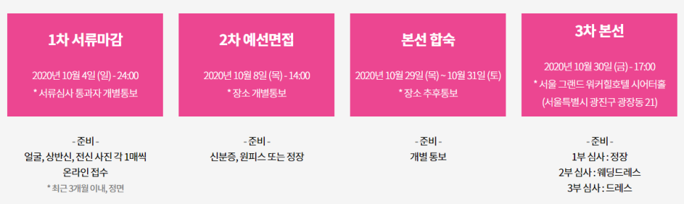 '2020 미스브라이드코리아'는 2020년 10월 4일 1차 서류가 마감되며, 서류심사 통과자에 한해 10월 8일 1차 예선 면접이 진행되고 본선 합숙 과정을 거쳐 10월 30일 서울 그랜드 워커힐호텔에서 3차 본선이 이뤄집니다.