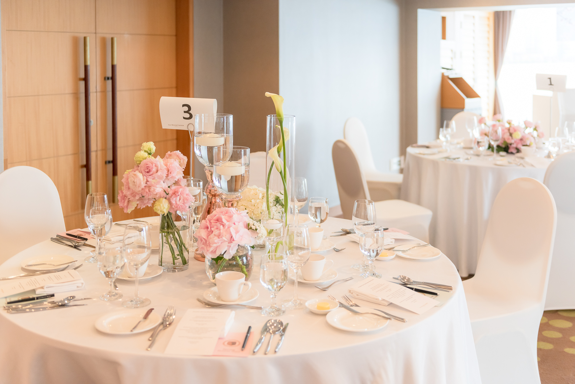 오늘의 미팅파티 분위기를 화사하게 채워 줄 센터피스입니다. <Spring Breeze Date>에 걸맞은 핑크 계열의 플라워 장식은 봄을 연상시키며 수려한 멋을 자랑하고 있습니다.