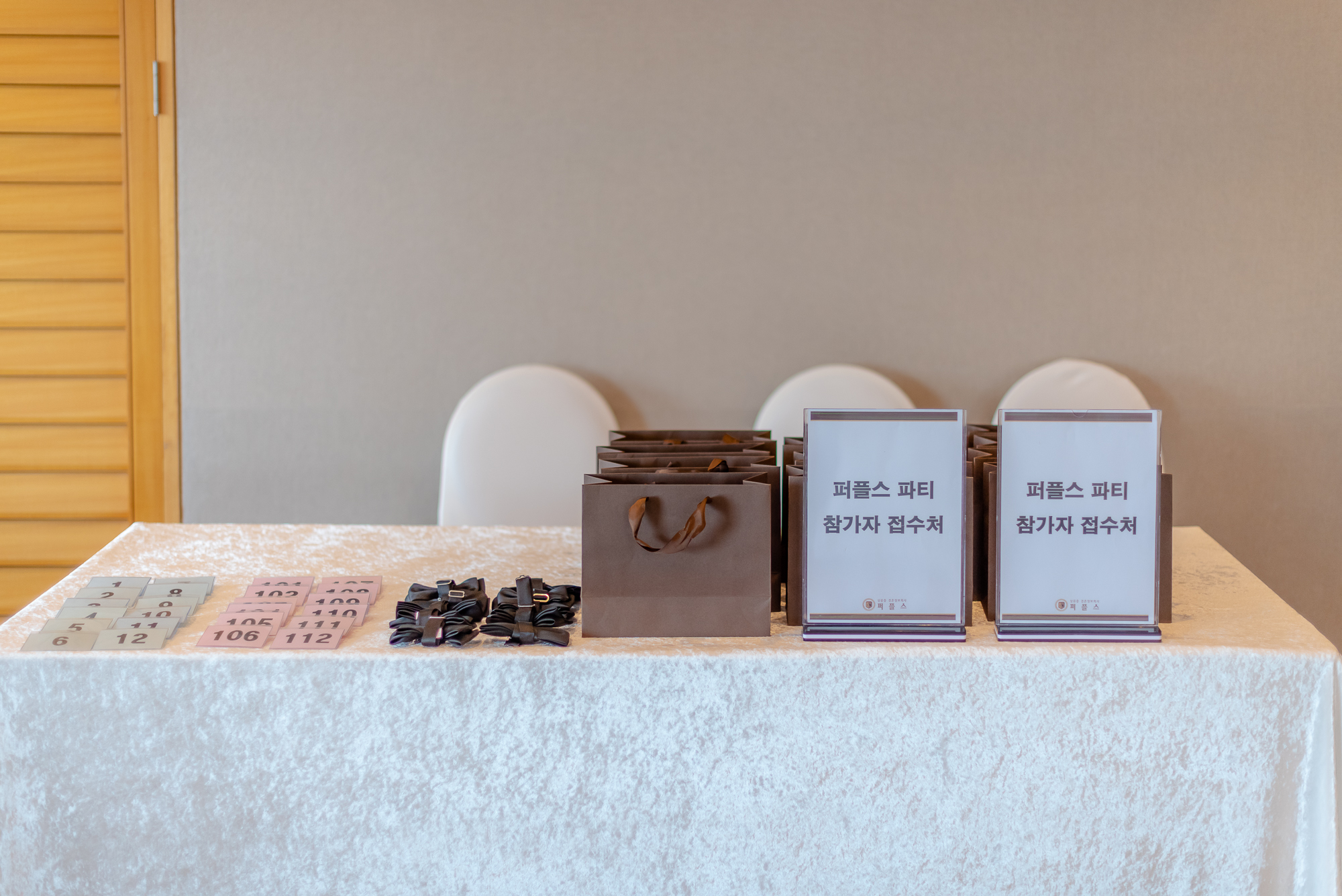 행사가 진행될 입구에는 회원님들의 이름을 대신할 명찰과 남성 참가자의 드레스코드인 보타이를 배치하였습니다. 회원님들은 이날 참석하는 다른 회원분들의 이름과 직업 등의 정보는 알지 못한 채 설레는 마음으로 파티장에 참석하게 되는데요. 1:1 만남이 아니다 보니 이름을 기억하는 것보다 번호를 기억하여 보다 쉽게 이상형 페이퍼에 기재할 수 있도록 명찰을 가슴에 부착하고 미팅파티에 임하게 됩니다.