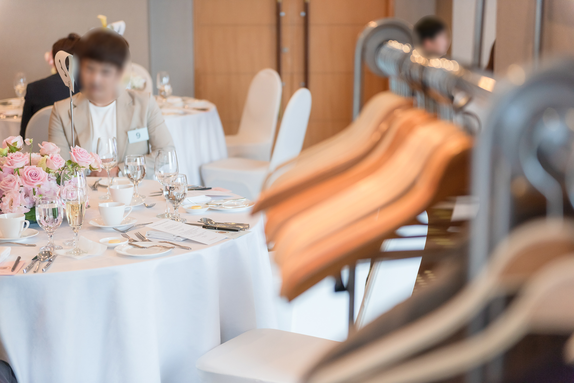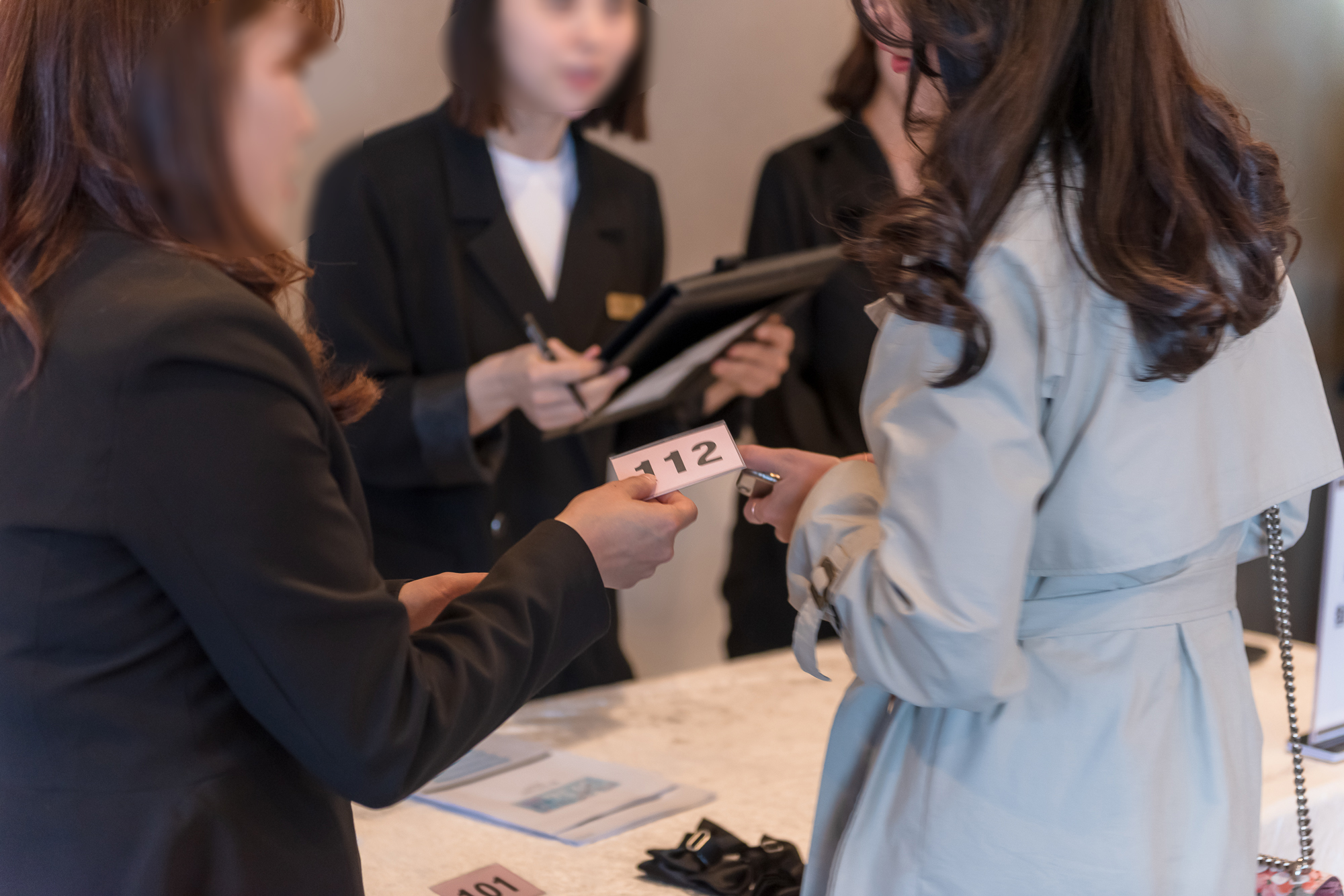 행사가 진행될 입구에는 회원님들의 이름을 대신할 명찰과 남성 참가자의 드레스코드인 보타이를 배치하였습니다. 회원님들은 이날 참석하는 다른 회원분들의 이름과 직업 등의 정보는 알지 못한 채 설레는 마음으로 파티장에 참석하게 되는데요. 1:1 만남이 아니다 보니 이름을 기억하는 것보다 번호를 기억하여 보다 쉽게 이상형 페이퍼에 기재할 수 있도록 명찰을 가슴에 부착하고 미팅파티에 임하게 됩니다.