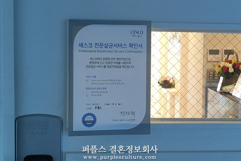 1. 퍼플스 부산결혼정보회사는 '세스코 멤버스존'으로 정기적인 위생관리와 소독을 진행하여 고객님들께서 안심하고 방문하실 수 있도록 노력하고 있습니다.