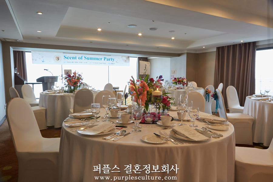 지난 6월 13일 '웨스틴 조선호텔 부산'에서 퍼플스의 <Scent of Summer Party> 미팅파티가 진행되었습니다. 더욱 프라이빗한 만남을 위해 24명의 회원들만이 참석하여 파티를 즐겨주셨는데요. 파티장은 화려한 색감의 센터피스를 사용하여 여름의 분위기를 더욱 살렸으며 전면 통유리창을 통해 해운대 바다가 펼쳐져 회원들의 만족도가 매우 높은 장소였습니다.