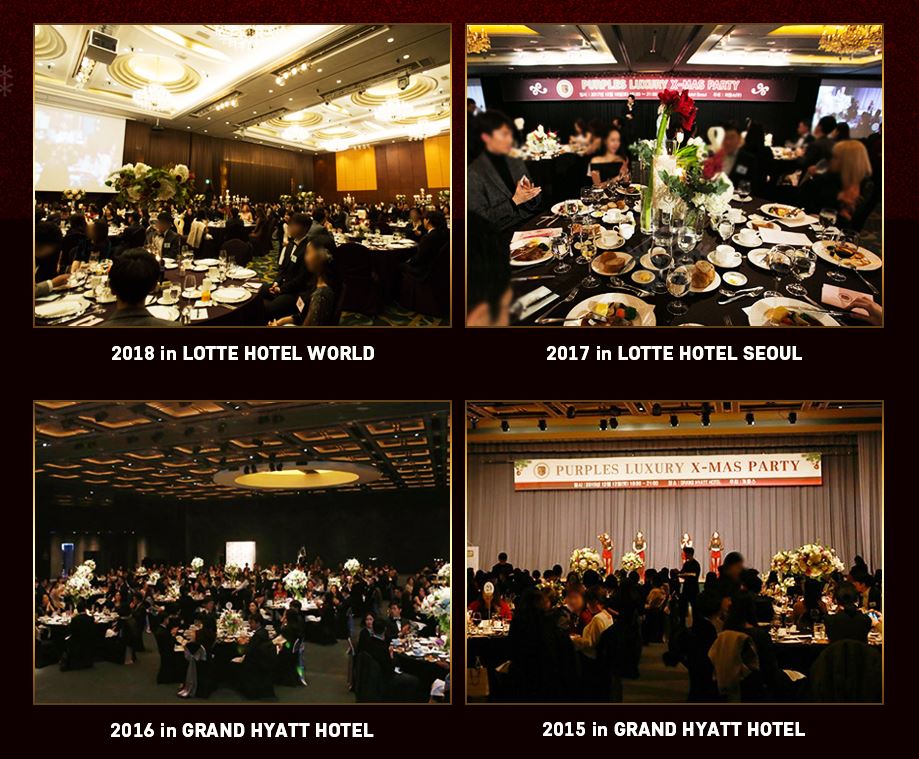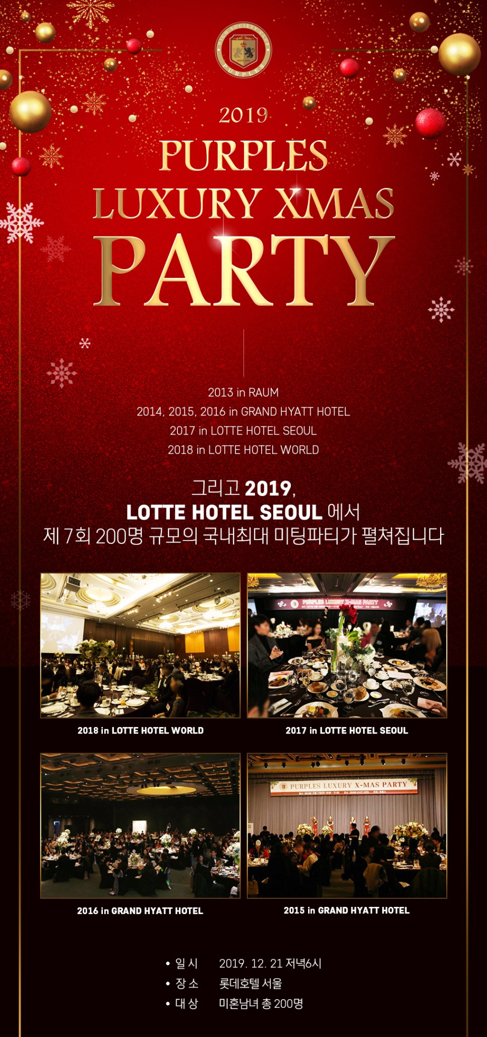 2013년 라움 아트센터를 시작으로 2014, 2015, 2016년 그랜드 하얏트 서울, 2017, 2018 롯데호텔에서 매년 개최되었던 대규모 사교모임 파티 '퍼플스 럭셔리 크리스마스 파티'가 롯데호텔 서울에서 개최됩니다. 미혼남녀 200명이 참석! 매년 수많은 성혼 커플이 탄생하는 '퍼플스 럭셔리 크리스마스 파티'!! 올해에는 어떤 커플이 탄생할지 기대가 되는데요. 오늘 이 시간에는 '2019 퍼플스 럭셔리 크리스마스'에 대해 자세히 알아보는 시간을 가지도록 하겠습니다.