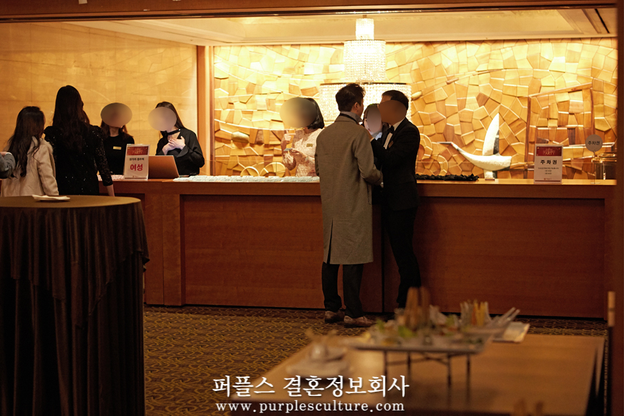 오후 6시 정각에 시작되는 퍼플스 사교모임 파티는 5시 30분이 되자, 많은 회원들의 입장이 시작되었습니다. 이날 서울 일대에서 시위가 일어나는 등 자칫 참석 회원들이 대거 지각할 수도 있는 상황이었지만, 대부분 제시간에 도착하는 매너를 보여주었으며, 역시 대한민국 상위 1% 미혼남녀들이 모이는 자리라는 것을 입증하였습니다.