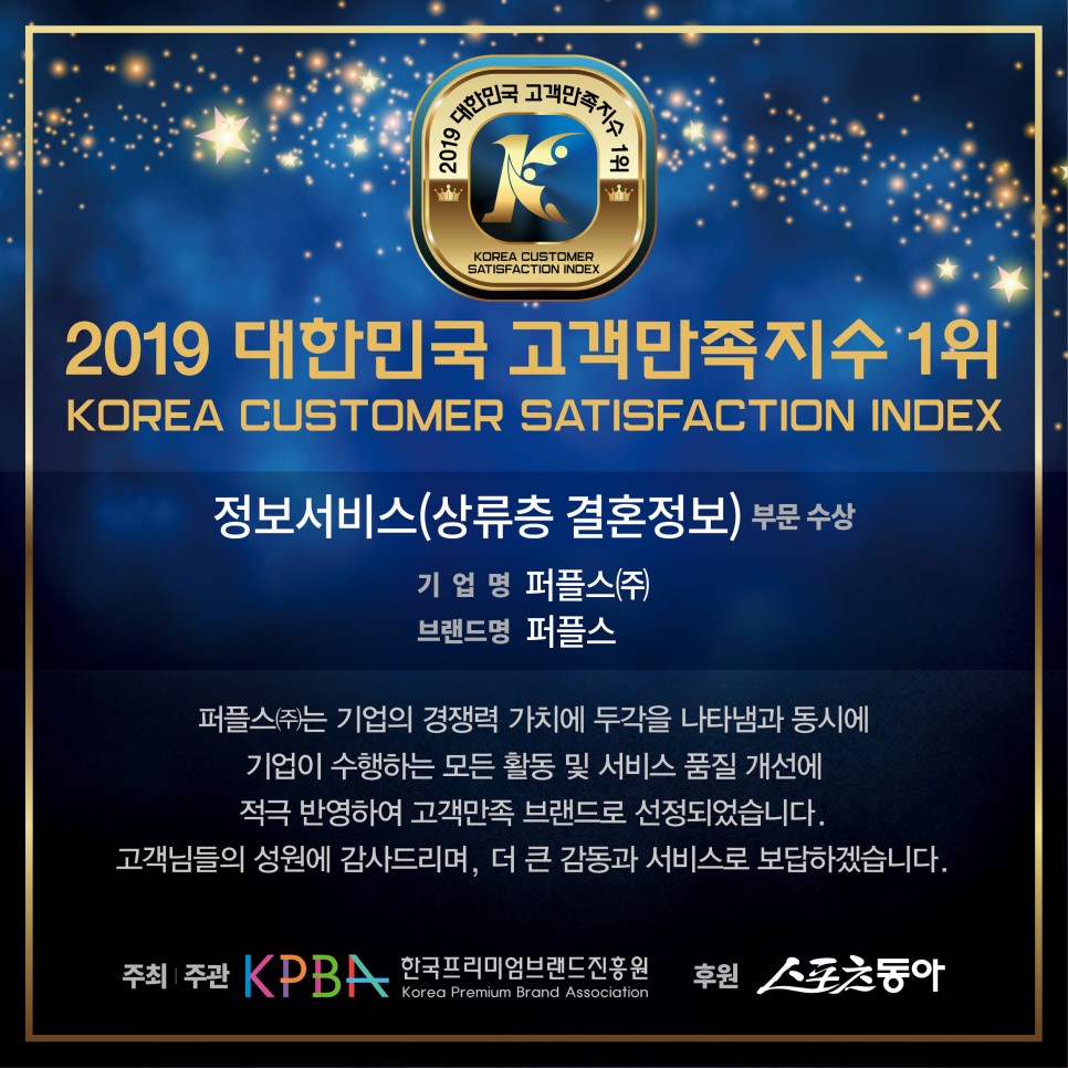 지난 10월 9일, 유니버셜 아트센터 대극장에서 2019 대한민국 고객만족지수 1위 시상식이 진행되었습니다. 한국 프리미엄브랜드진흥원이 주최하고 스포츠동아, MK 스포츠, 데일리경제, 시사타임이 후원한 2019 대한민국 고객만족지수 1위 시상식은 엄정하고 공정한 심사를 통해 상류층결혼정보업체 퍼플스를 포함하여 총 13개의 업체만이 수상의 영광을 누렸습니다.