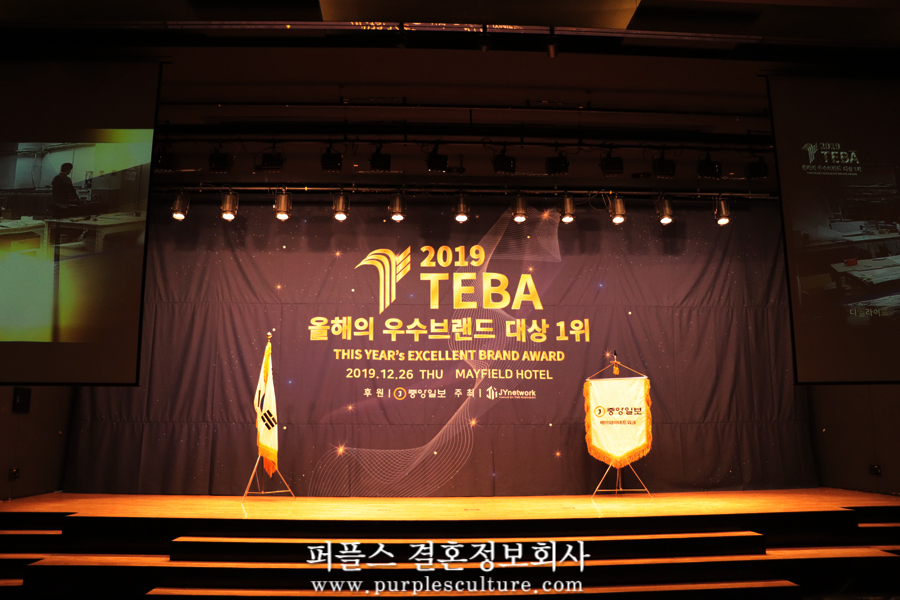지난 2019년 12월 26일, 강서구 메이필드 호텔에서 '2019 올해의 우수브랜드 대상 1위' 시상식이 진행되었습니다. 올해로 3년 연속 수상한 상류층결혼정보업체 퍼플스는 결혼정보 부문에서 결혼정보업체 중 유일하게 수상하였으며 공신력 있는 언론사 중앙일보에서 선정되었다는 점에서 더욱 영광스러운 자리었습니다. 그럼 '2019 올해의 우수브랜드 대상 1위' 수상 현장을 가보실까요?