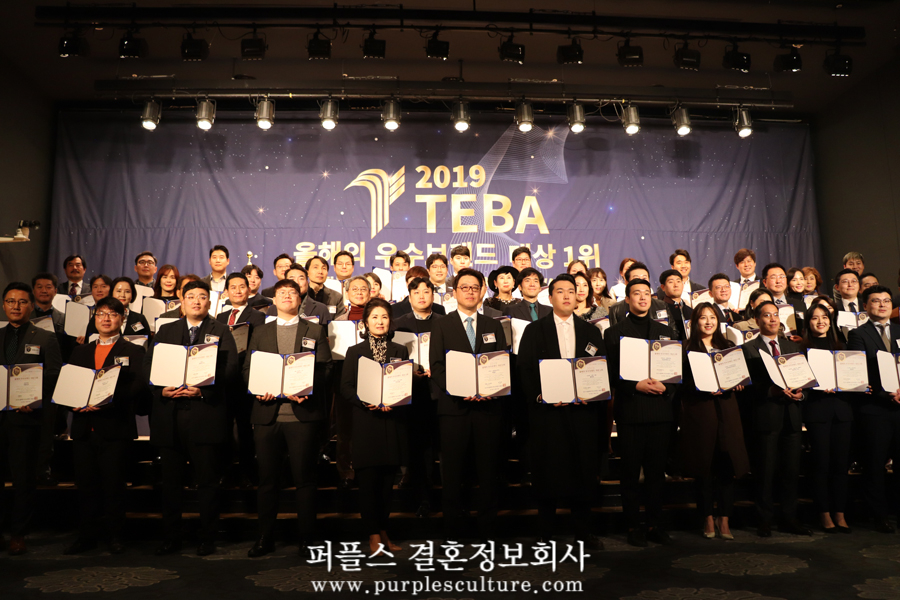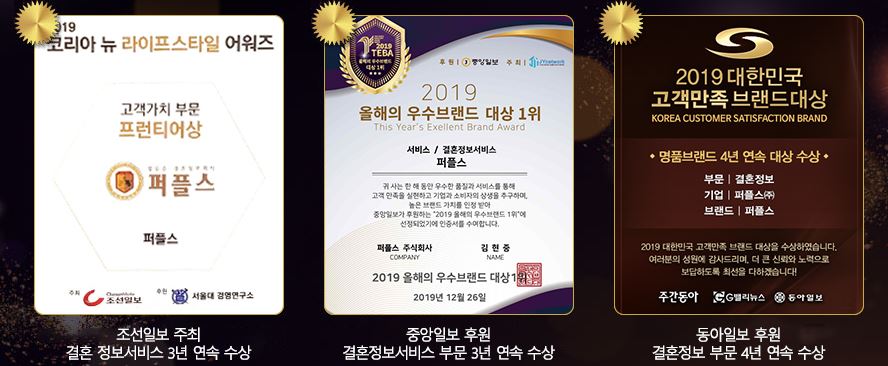 '2019 올해의 우수브랜드 대상 1위'는 중앙일보가 후원하고 JY네트워크가 주최하였으며 서류심사와 최종심사를 거쳐 상류층결혼정보업체 퍼플스를 포함한 68개의 기업과 브랜드가 수상의 기쁨을 누렸습니다. 특히 퍼플스는 3년 연속 수상이라는 점에서 더욱 가치있는 수상이었습니다.