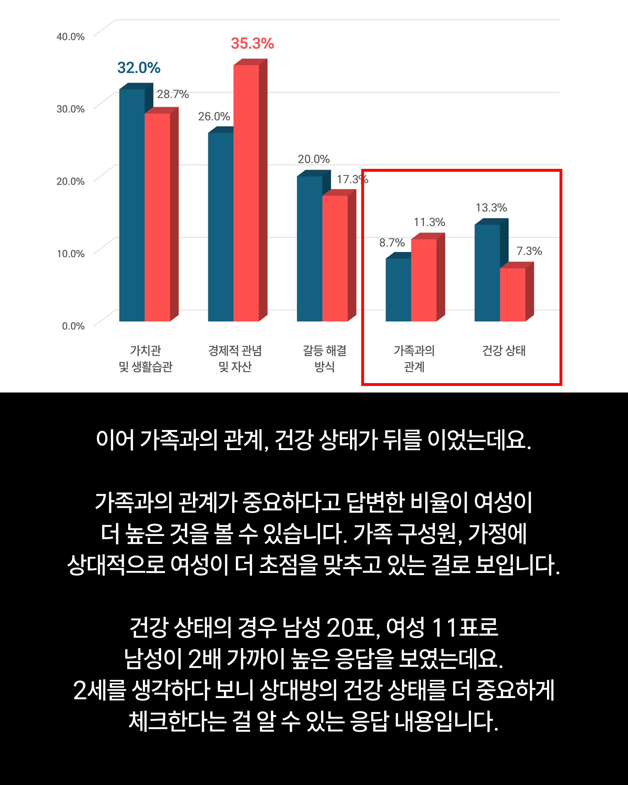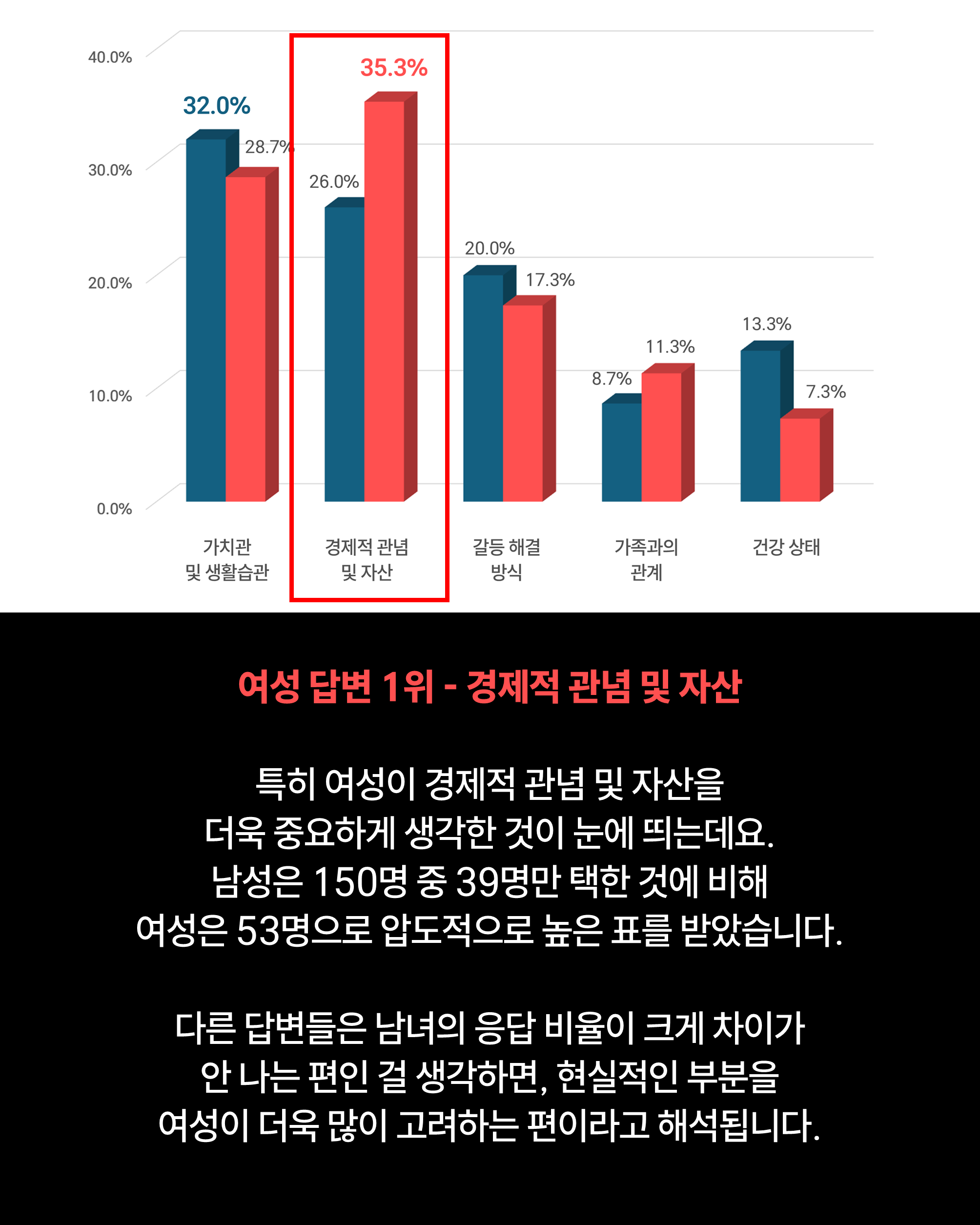 특히 여성이 경제적 관념 및 자산을 더욱 중요하게 생각한 것이 눈에 띄는데요.