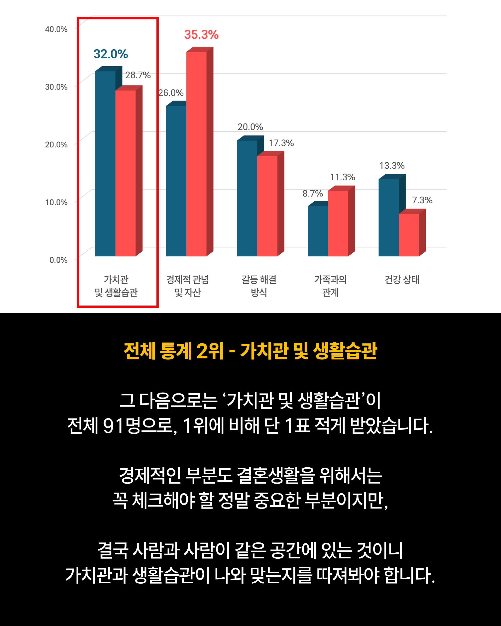 전체 통계 2위는 '가치관 및 생활습관'입니다. 1위로 뽑혔던 경제적 관념 및 자산이