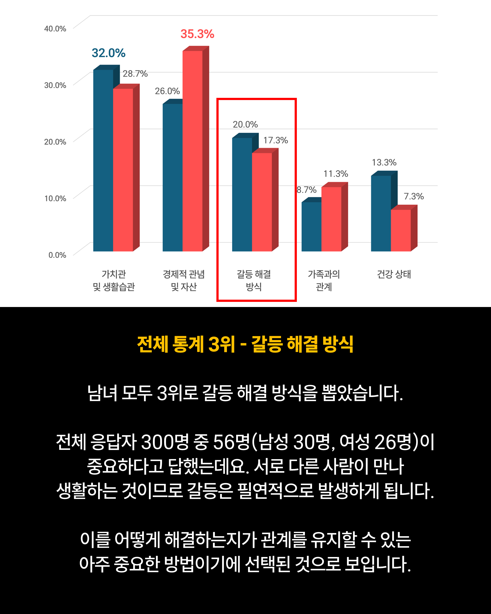 남녀 모두 3위로는 갈등 해결 방식을 뽑았습니다.