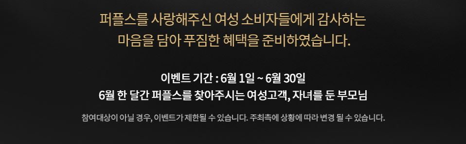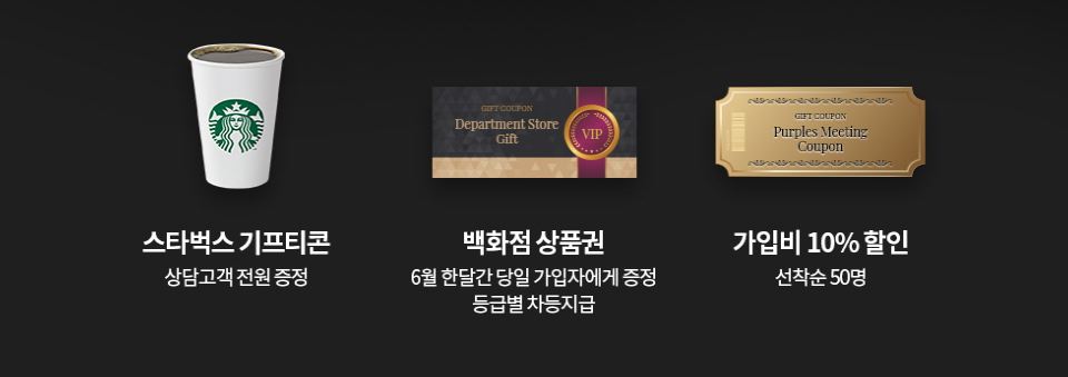 이벤트 안내를 자세하게 해드리자면 6월 1일부터 6월 30일, 6월 한 달간 서울결혼정보회사 퍼플스를 찾아주시는 여성고객과 자녀를 둔 부모님들을 대상으로 진행되며 혜택으로는 퍼플스 방문상담 고객 전원에게 스타벅스 기프티콘, 당일 가입자에게 백화점 상품권, 선착순 50명에게 가입비 10% 할인이 제공됩니다.