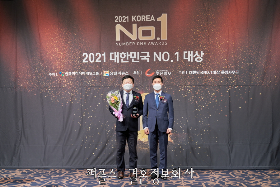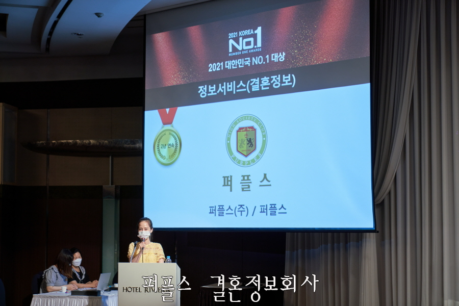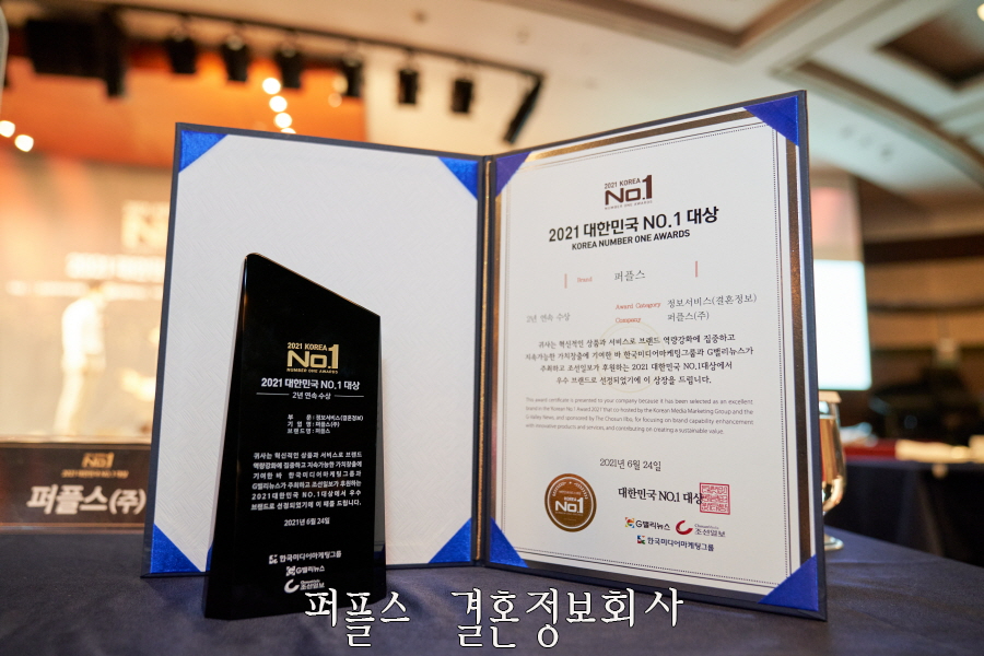 '2021 대한민국 No.1 대상'은 기업 경영 전략, 기업·브랜드 시스템, 기업의 관리, 경영 성과 등으로 나눠 엄격하고 공정한 심사에 의해 39개의 브랜드가 선정되었는데요. 결혼정보업계 중에서는 서울 결정사 퍼플스가 유일하게 수상하였으며, 군내 현존하는 언론사 중 가장 오래되고 저명한 조선일보가 후원하였기에 더욱 영광스러운 수상이었습니다.