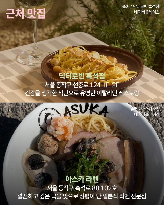 식당과 카페를 소개드립니다. 현충원 정문에서 흑석역 방향(도보 약 10~15분)으로