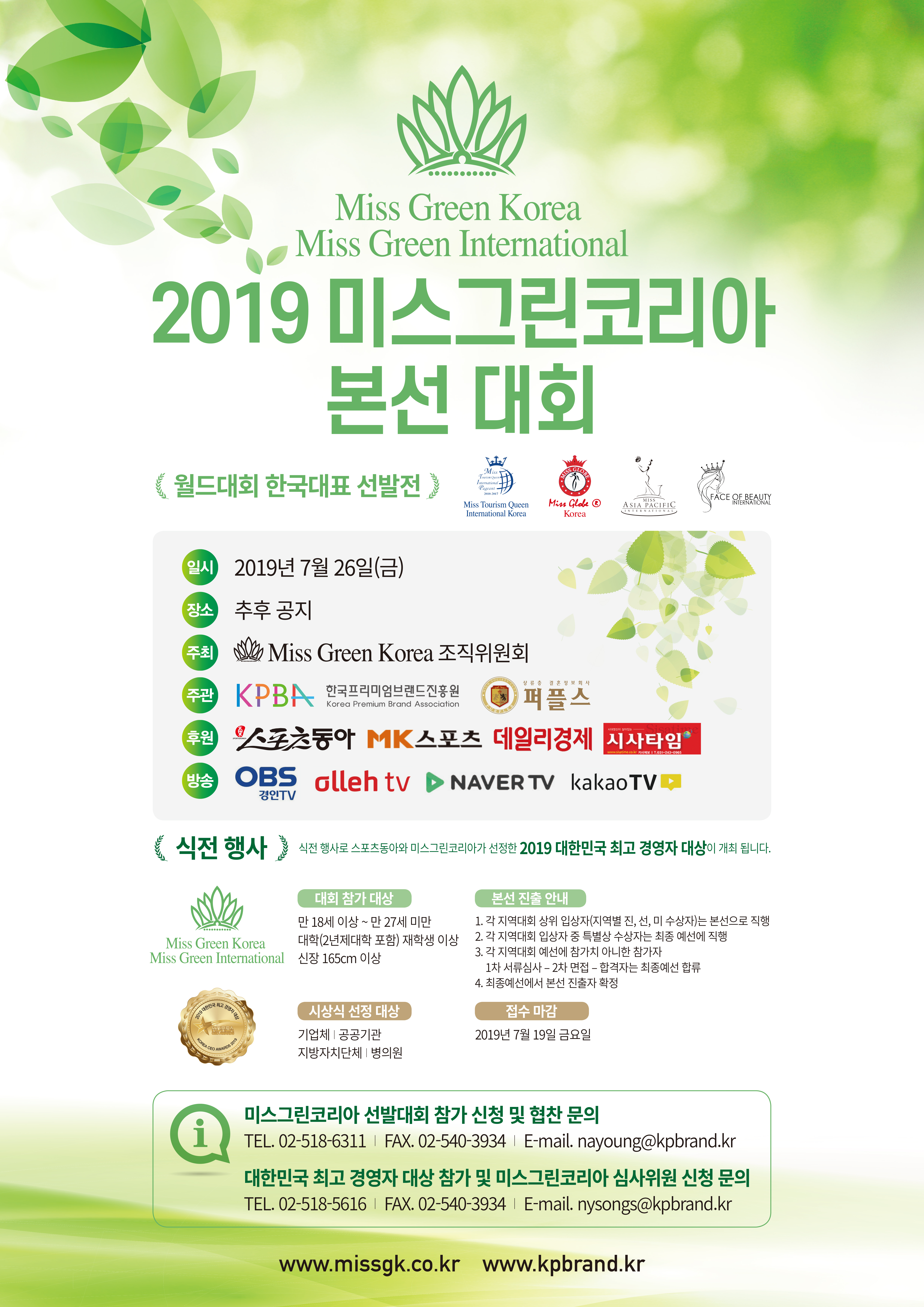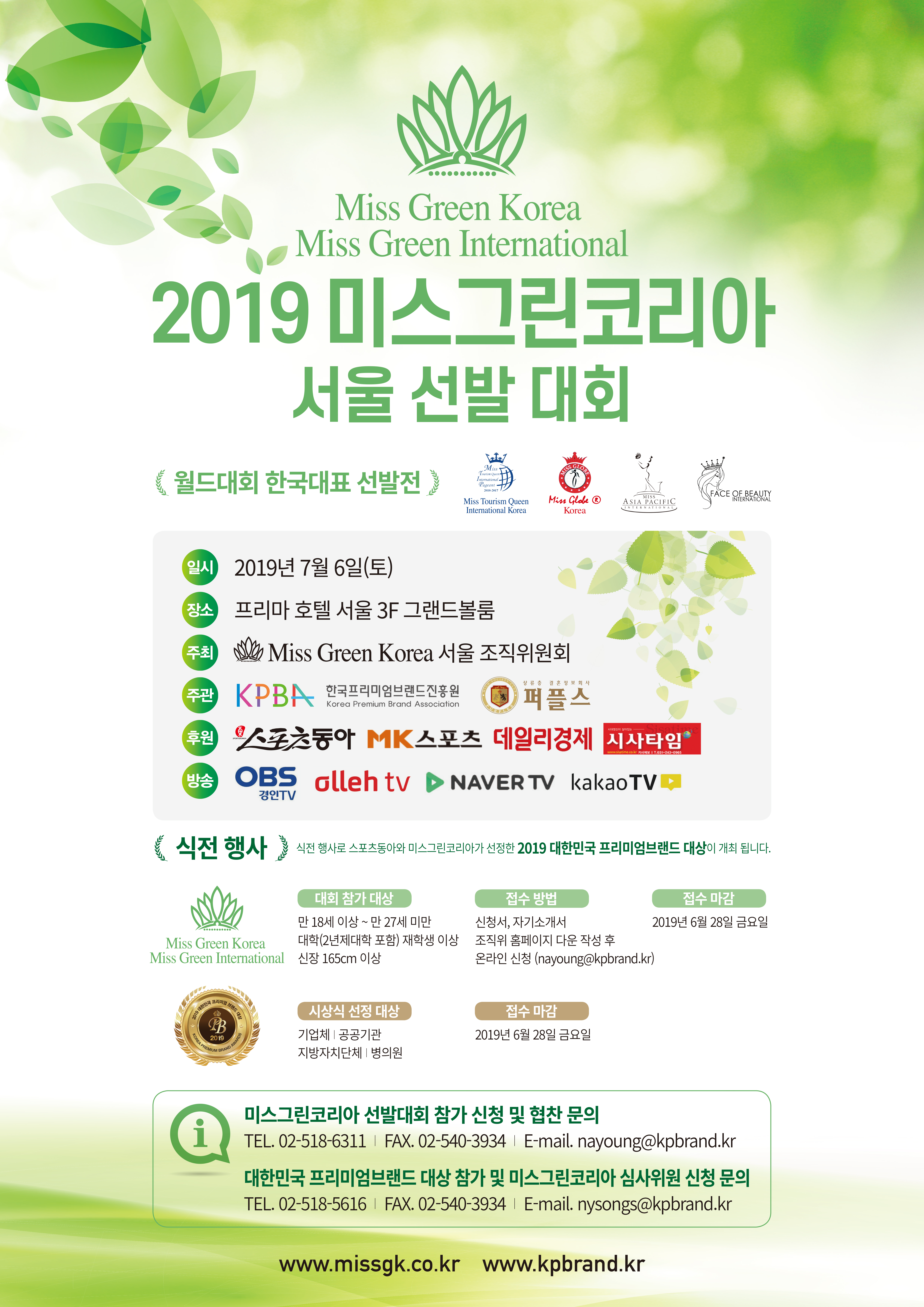 미스그린코리아는 스포츠동아와 MK 스포츠, 데일리경제, 시사 타임 후원하고 한국프리미엄브랜드진흥원과 아나운서 결혼 성사시키는 결혼정보업체 퍼플스가 공동 주관하는 국내 최고의 미인대회로서, 친환경 홍보와 더불어 사회 부조리와 모순에 대처하고 깨끗한 세상 만들기에 앞장서서 사회 공익성에 기여하는 취지와 목적으로 2011년부터 개최해 온 대회입니다.