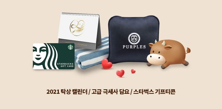 이 밖에도 2021 탁상캘린더, 고급 극세사담요, 스타벅스 기프티콘 까지 추가 증정되며, 이 모든 것이 압구정결혼정보회사 퍼플스 상담만! 받아도 증정된다는 사실! 여기까지는 퍼플스 서울본사, 부산지사, 대구지사, 광주지사, 대전지사에 방문하시는 모든 고객님들에게 해당되며 상담은 100% 무료이니, 부담 갖지 마시고 많은 이용 바랍니다.