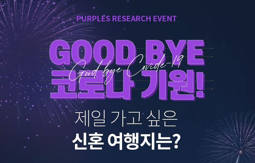 다음에 전해드릴 압구정결혼정보회사 퍼플스 소식은 9월 이벤트입니다. 코로나19가 시작된 지도 1년이 넘었지만 종식이 보이지 않아 예비 신혼부부들의 해외 신혼여행의 꿈은 점점 사라져가고 있는데요. 하지만 이럴 시기일수록 희망을 잃지 않는다면 언제 가는 해외여행할 수 있는 날이 오지 않을까요? 이런 의미를 담아 압구정결혼정보회사 퍼플스에서는 굿바이 코로나 기원! 제일 가고싶은 신혼 여행지는? 리서치 이벤트를 실시합니다.