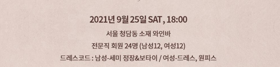 코로나 19로 인해 소수의 인원만을 모집하여 더욱 퀄리티 있는 파티를 진행하고 있는 압구정결혼정보회사 퍼플스는 9월을 맞이하여 와인을 컨셉으로 한 미팅파티 <가을향기> 를 진행합니다. 와인 소믈리에와 함께해서 더욱 특별한 9월 미팅파티! 더욱 자세히 알아보도록 하겠습니다.