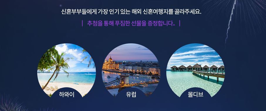 신혼부부들에게 가장 인기 있는 해외 신혼여행지는 하와이, 유럽, 몰디브로 꼽히고 있는데요. 과연 이 중에서 1위는 어디일까요? 리서치 참여는 무료이며, 추첨을 통해 푸짐한 선물을 증정하고 있습니다.
