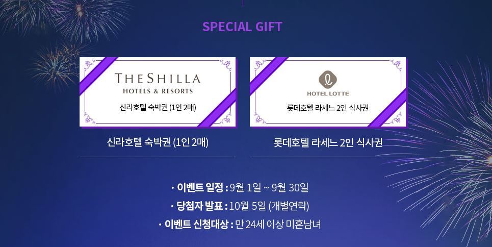 먼저 신라호텔 숙박권 (1인2매), 롯데호텔 라세느 2인 식사권이 준비되어 있습니다. 이벤트 일정으로는 9월 1일부터 9월 30일까지 이어지며 당첨자 발표는 10월 5일에 당첨자에게 개별연락 갈 예정입니다. 이벤트 신청대상으로는 만 24세 이상 미혼남녀라면 누구나 신청할 수 있기 때문에 많은 참여 바라며 아래의 배너를 클릭하시면 참여 사이트로 이동됩니다.