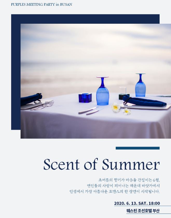 현재 퍼플스는 다가오는 6월, 웨스틴 조선호텔 부산에서 부산미팅파티가 진행될 예정인데요. 결혼 적령기의 의사, 약사, 사업가, 교사, 승무원분들이 참가할 예정이며 특급호텔 코스요리와 샴페인, 고급 레드와인이 무제한 제공됩니다. 또한, 로테이션 프리토킹을 통해 다양한 이성과 대화를 나눌 수 있으며 파티 종료 후 가장 마음에 들었던 이성 10명을 기재하여 제출하면 매칭을 통해 1:1 만남이 성사됩니다. 더욱이 이번 부산미팅파티는 남녀 각 12명이 참가하는 소규모 파티이기 때문에 매칭될 확률이 높고 서로에게 더 집중할 수 있기 때문에 약사결혼을 원하신다면 이번 6월 퍼플스 미팅파티를 추천드립니다.