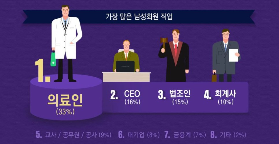 그러나 결혼정보회사의 경우에도 일반 직장인 회원의 성혼에 도움을 주는곳이 있는가 하면 의료계, 법조계, CEO, 재벌가 등 상류층의 성혼을 전문적으로 담당하는 회사가 있는데요. 결혼정보회사 퍼플스의 정회원 통계를 보면 남성 회원 중 33%가 의료계 종사자이며 여성 회원의 경우에도 18%가 의료인 즉, 약사결혼과 약사소개팅이 가능한 분들임을 알 수 있습니다. 때문에 약사결혼을 꿈꾸는 일반 직장인 분들이라면 결혼정보회사 퍼플스를 통해 약사와의 만남을 가지실 수 있으며 더 나아가 약사결혼까지 이루실 수 있습니다.